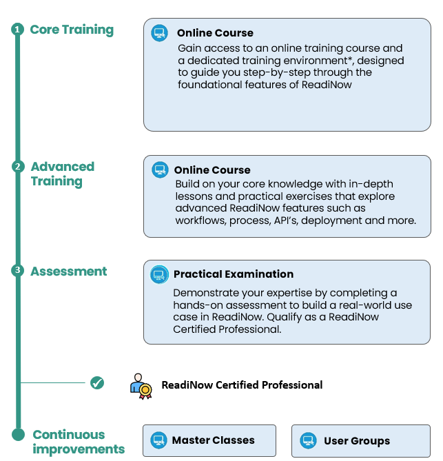 | Core Training | An online course providing step-by-step guidance through ReadiNow's foundational features | New System Administrators, Business Analysts | Intermediate Microsoft Office skills, cloud software experience, business context |